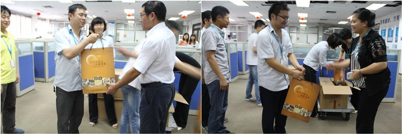 图为公司总经理为员工发放中秋福利 图为公司副总经理为员工发放中秋福利