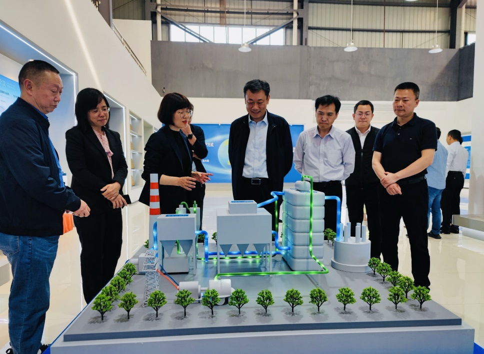 易态科技副总经理张丽红(左三)与副总工蒋敏(左一)为刘毅院长(中)、刘书明书记(左五)、刘会娟主任(左二)等专家及曹波副县长(右一)介绍公司绿色工艺